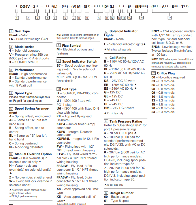 2.阀门类型 DG4V –底板安装的电磁方向控制阀(350 BAR [5000 PSI])