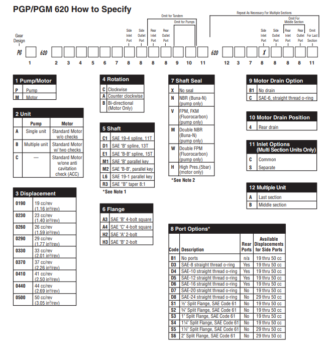 单个Parker PGP620系列泵有12种排量,从16cc / rev到52cc / rev:PGP620A-0160 | PGP620A-0190 | PGP620A-0230 | PGP620A-0260 | PGP620A-0290 | PGP620A-0330 | PGP620A-0360 | PGP620A-0370 | PGP620A-0410 | PGP620A-0440 | PGP620A-0500 | PGP620A-0520
