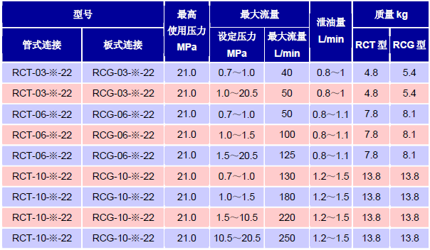 公布油研单向减压阀RCT系列技术参数,如图所示: