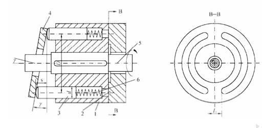 轴向柱塞泵是将多个柱塞配置在一个共同缸体的圆周上,并使柱塞中心线和缸体中心线平行的一种泵。轴向柱塞泵有两种形式,直轴式(斜盘式)和斜轴式(摆缸式),如图所示为直轴式轴向柱塞泵的工作原理,这种泵主体由缸体1、配油盘2、柱塞3和斜盘4组成。柱塞沿圆周均匀分布在缸体内。斜盘轴线与缸体轴线倾斜一角度,柱塞靠机械装置或在低压油作用下压紧在斜盘上(图中为弹簧),配油盘2和斜盘4固定不转,当原动机通过传动轴使缸体转动时,由于斜盘的作用,迫使柱塞在缸体内作往复运动,并通过配油盘的配油窗口进行吸油和压油。回转方向,当缸体转角在π~2π范围内,柱塞向外伸出,柱塞底部缸孔的密封工作容积增大,通过配油盘的吸油窗口吸油;在0~π范围内,柱塞被斜盘推入缸体,使缸孔容积减小,通过配油盘的压油窗口压油。缸体每转一周,每个柱塞各完成吸、压油一次,如改变斜盘倾角?,就能改变柱塞行程的长度,即改变液压泵的排量,改变斜盘倾角方向,就能改变吸油和压油的方向,即成为双向变量泵。