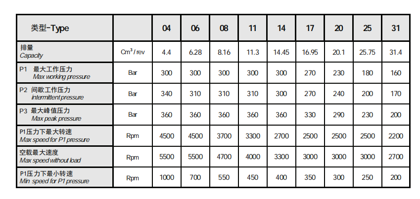 - 容量从 4 到 31cc/rpm – 0.244 到 1.891 cu in/rpm;