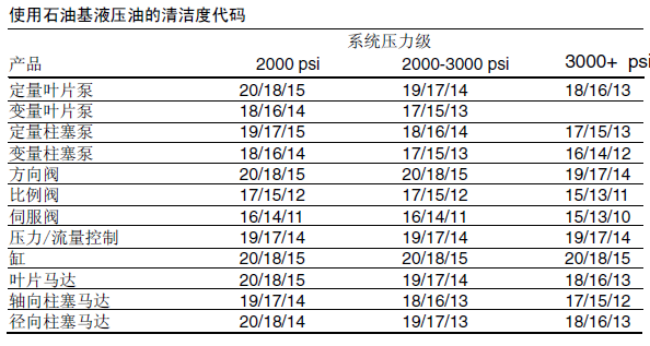 3、使用抗磨液压油或汽车曲轴箱油时推荐的清洁度等级基于系统中的最高油液压力等级并编号于下表中。其他允许的油液、重载工作循环或极端温度是调整这些代号的理由。准确的细节见威格士出版物561。