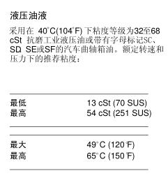 当使用SAE 10W 油在860 至54 cSt(4000至251 SUS) 范围内工作时,转速和压力应限制在它们各自额定值 50% 以内,直到系统热起来。油液粘度超过860 cSt(4000 SUS)起动时要特别注意。应留心使整个系统包括远处的缸和马达都热起来。