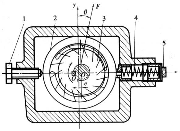 1-调节流量螺钉,2-定子,3-转子, 4-限压弹簧,5-限压螺钉
