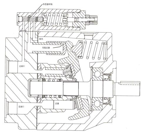 泵中的缸体由驱动轴通过电机驱动,装在缸体孔中的柱塞连着柱塞滑靴和滑靴压板,所以滑靴顶在斜盘上。当缸体转动时,柱塞滑靴沿斜盘滑动,使柱塞沿平行于缸体的旋转轴线作往复运动。配流盘上的油口布置成当柱塞被拉出时掠过进口,当柱塞被推入时掠过出口。泵的排量取决于柱塞的尺寸、数量及行程。而柱塞行程则取决于斜盘倾角。改变斜盘倾角可加大或减小柱塞行程。斜盘倾角可用下述任何一种方法调整,如手动控制、伺服控制、压力补偿控制及负载传感加限压器控制等。图1所示即为压力补偿器控制的泵。