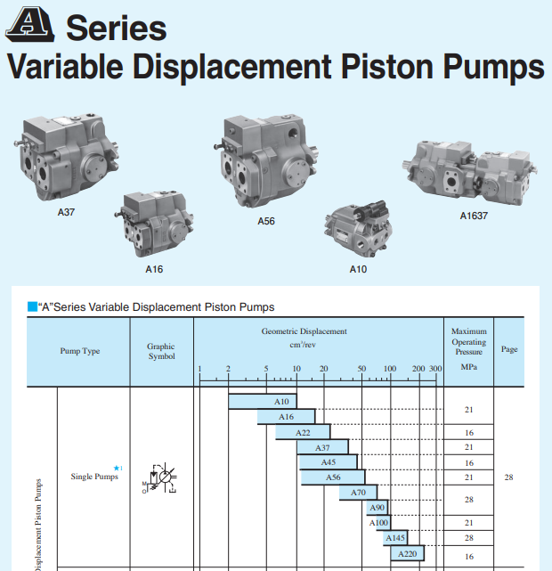 Yuken“A”系列变量柱塞泵是采用Yuken独特技术开发的高效斜盘式柱塞泵,以满足客户对节能和低噪音解决方案的需求。这些泵支持多种排量尺寸和控制类型,广泛用于各种液压系统。