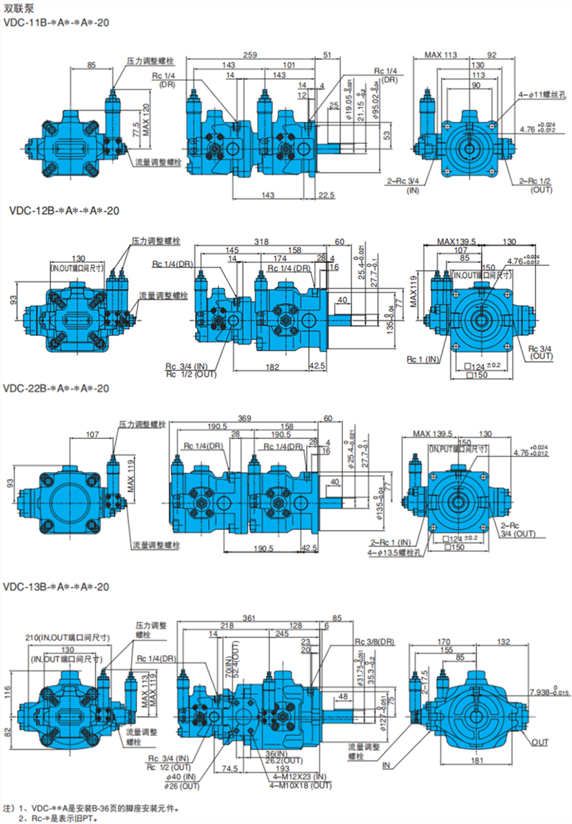 不二越VDC系列高压变量叶片双联泵安装尺寸图: