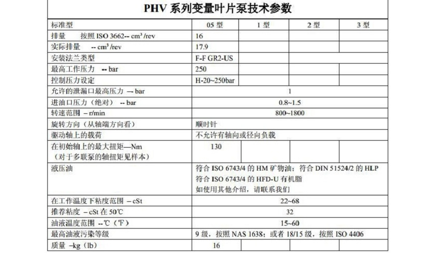 PHV系列变量叶片泵的技术规格因型号而异,但通常包括排量、工作压力、转速范围等参数。具体的技术规格需参考产品说明书或联系厂家获取。