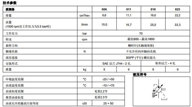提供四种尺寸,最大位移为6.6至22.2 cm3 / rev,压力调节器的两个最大校准值可达35 bar和70 bar(标准)。