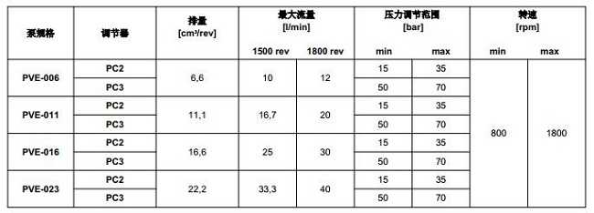 - PVE泵有四种尺寸,最大排量为6.6至22.2 cm 3 / rev,压力调节器的两个最大校准值可达35 bar和70 bar(标准)。