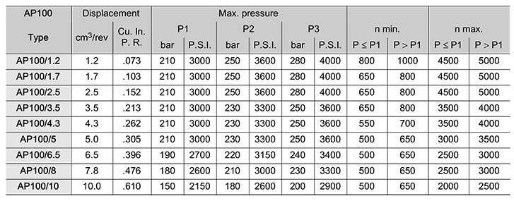 外齿轮泵,铝,1.2 - 10.0排量cm?/ rev。AP系列产品包括单泵05-100-212-212HP-250HP-300-312HP(对应公共组别名称:05-1-2-2.5-3)以及双泵,三泵和等等,可根据排量,翻边和辅助阀的型号组装在一起。
