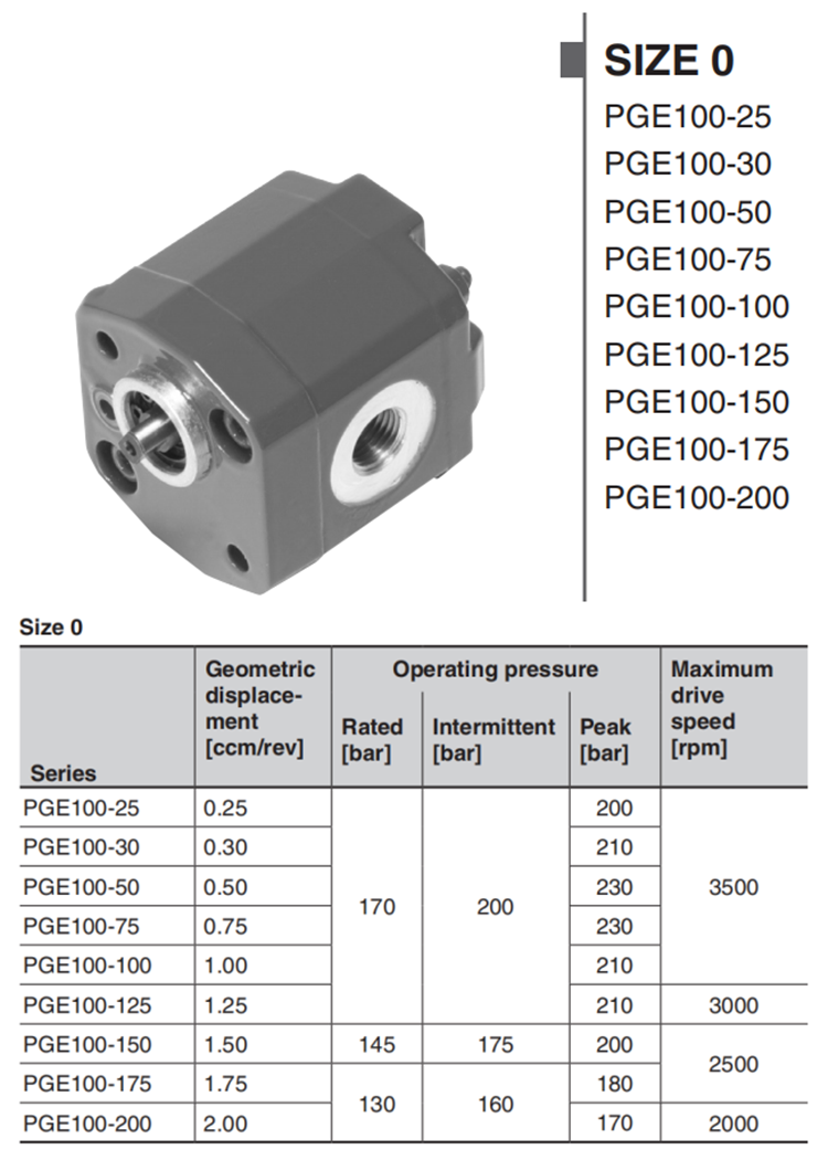 PGE100 是我们用于开环液压系统的外啮合齿轮泵的 0 号尺寸。