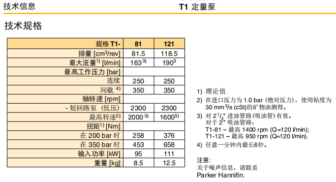 派克 T1 泵有 T1-81 和 T1-121 可供选择——详情请参见规格标签。