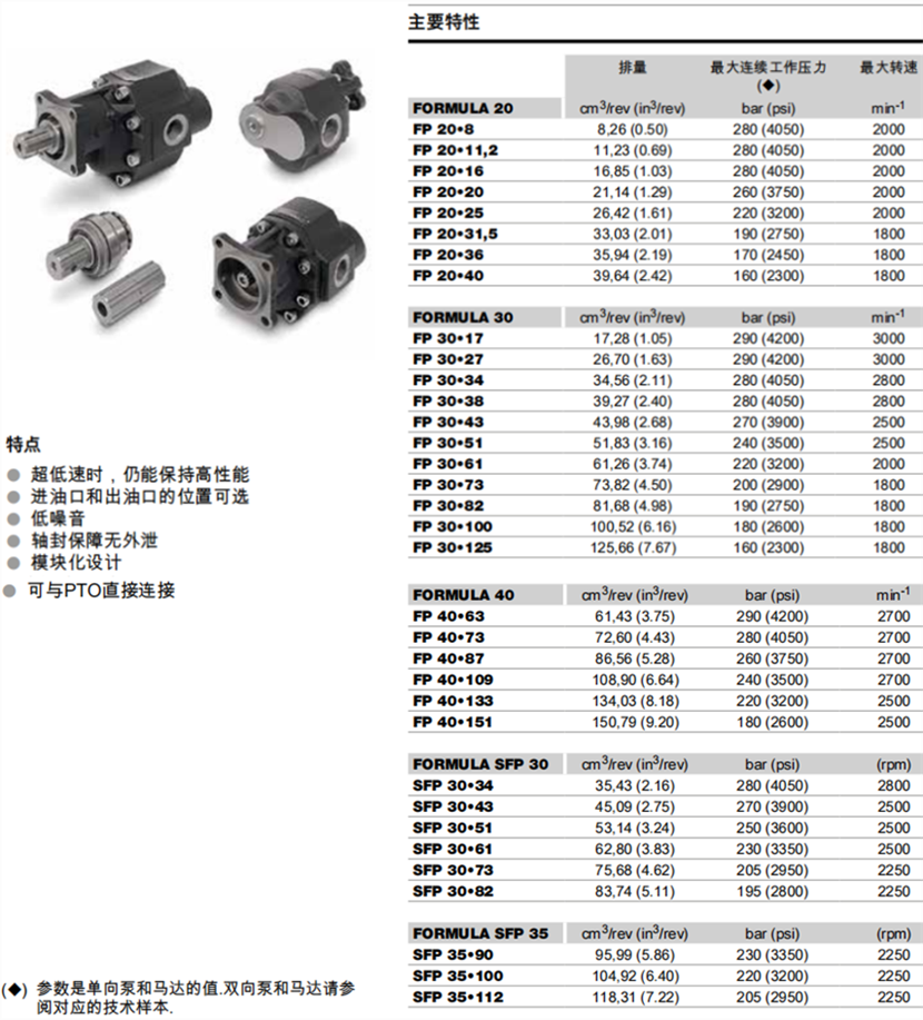 排量范围:从8,26 cm3/rev (0.50 in3/rev) 到150,79 cm3/rev (9.20 in3/rev);分20, 30, 35和40四个规格。