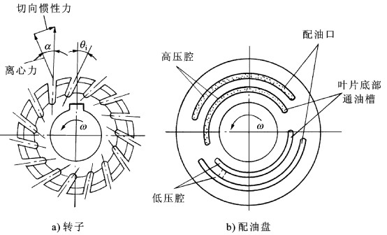 上述工作原理表明,改变定子与转子偏心距的方向也就改变了泵的吸、压油口,即原来的吸油口变成压油口,原来的压油口变成吸油口;改变上述偏心距的大小意味着改变了泵的排量。 当偏心量为零时,密封容腔不会有容积变化,因此也就不具备液压泵的工作条件了。同样道理,为了使叶片运动自如、减小磨损,叶片槽通常向后(注意,这里与双作用叶片泵不同)倾斜20o~30o。 图3.20为单作用 叶片泵的配油盘和转子结构简图。